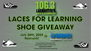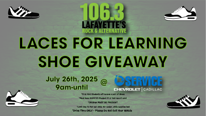 2nd Annual Laces For Learning Shoe Giveaway! July 15, 2025 / acredeur 1063 Lafayette’s Rock & Alternative is gearing up for our 2nd Annual Laces for Learning, powered by Service Chevrolet Cadillac! We’re excited to help children in need start the school…